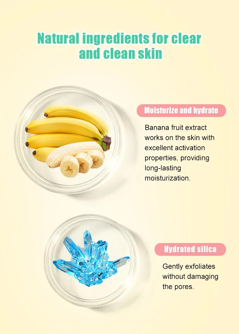 Effect:With soft and delicate scrub particles, it can gently rub off the CUTIN through massage, improve chicken skin, effectively enhance the skin glossy. It refreshes and smoothes the skin with a pleasant banana aroma.